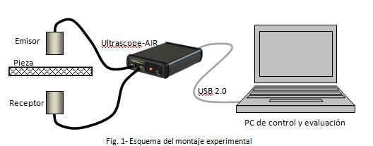La tecnología de inspección por ultrasonidos en aire a presión atmosférica, esto es, sin necesidad de medios líquidos o sólidos de acoplamiento entre transductores y pieza. La tecnología incluye transductores, electrónica y procesamiento digital para inspecciones por transmisión. La Figura 1 muestra 4 posibles configuraciones de inspección, y la figura 2 el arreglo experimental utilizado en este trabajo.