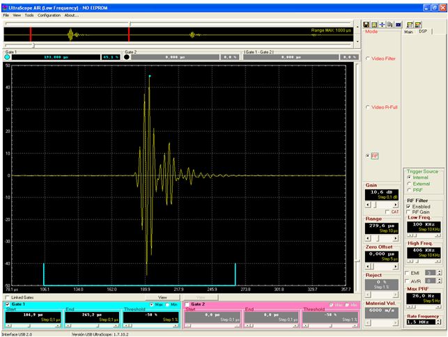 Para evitar la saturación del amplificador de entrada, dado el elevado nivel de señal, se redujo la excitación a 50 V, única diferencia respecto a otros experimentos (en los que la excitación se eleva a 400 V, valor estándar de inspección). La ganancia aplicada fue G=10.6 dB para obtener una indicación VS=0.9. La relación del pico de señal al del ruido es SNR≈60 dB. Las pérdidas de inserción son A0 = 45 dB y las normalizadas B0 = 0 dB.